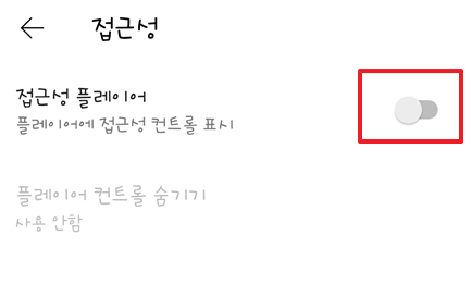 접근성 플레이어가 켜져 있다면 버튼을 눌러 회색 버튼으로 비활성화시켜줍니다.